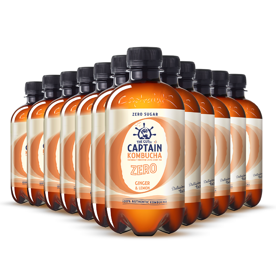 - Pack de 12x400mL de GUTsy Captain Kombucha Zero Jengibre y Limón.