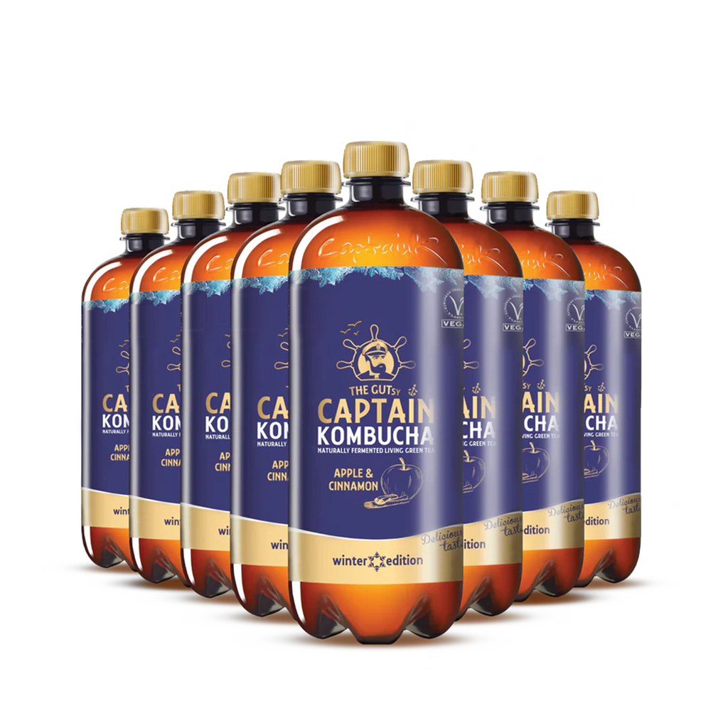 - Este pack contiene 8 botellas de 1L de GUTsy Captain Kombucha Manzana y Canela - Edición Limitada de Invierno.