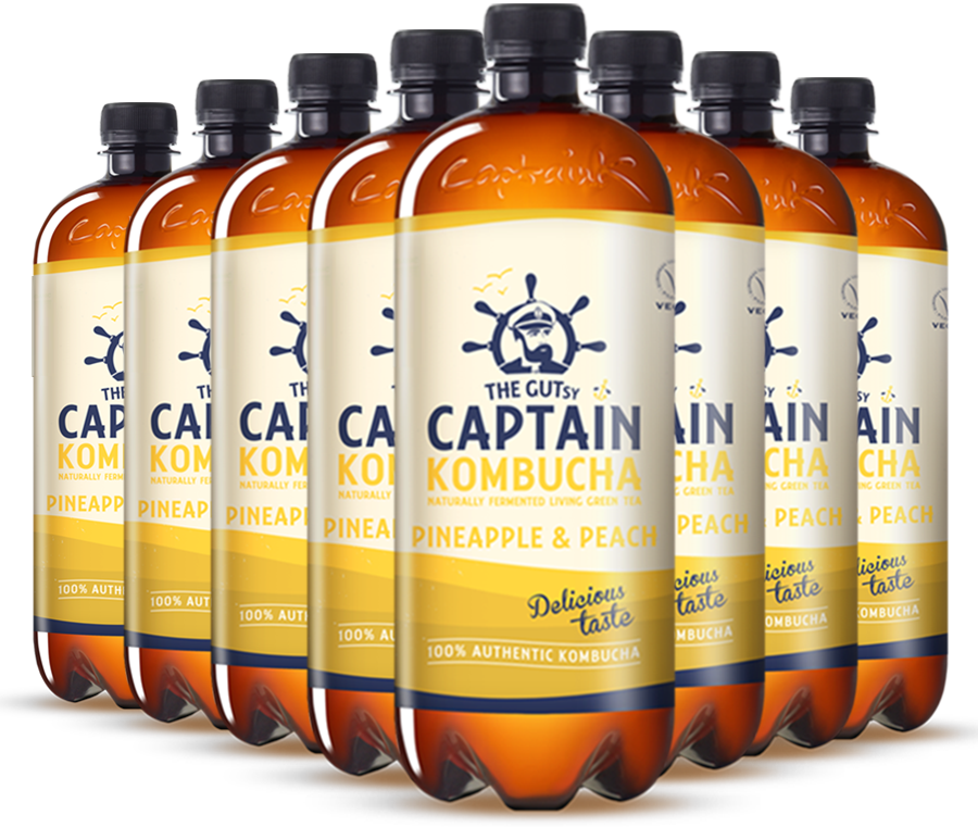 - Pack de 8x1L de GUTsy Captain Kombucha Piña y Melocotón.
